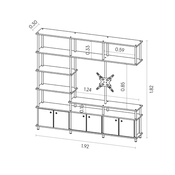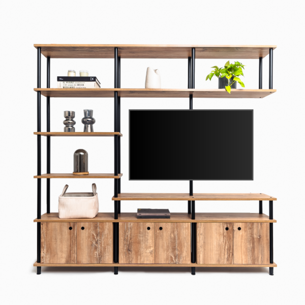 Transformá tu espacio con nuestro separador de ambientes de 3 cuerpos. Este diseño moderno, construido con siete niveles de apoyo, 3 módulos adicionales con puertas. Ofrece un soporte exclusivo y giratorio, ideal para un televisor de hasta 55″ (tener en cuenta al tomar las medidas el marco de la tv).