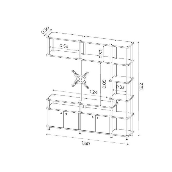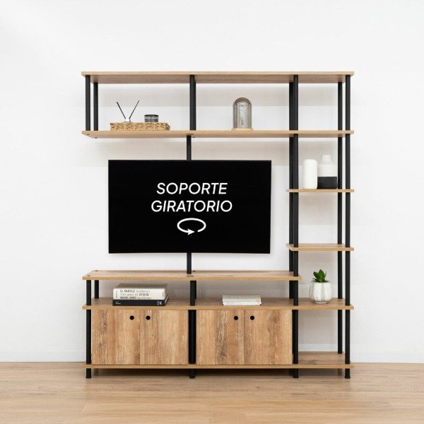 Este separador de 3 cuerpos está construido con siete niveles de apoyo y dos módulos adicionales con puertas, ideal para mantener todo en orden. Además, su soporte giratorio se adapta a un televisor de hasta 55″ (tener en cuenta al tomar las medidas el marco de la tv), ¡perfecto para tu sala de estar!